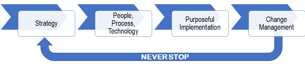 Build and pursue a strategy. Don’t go after tactical fixes or point solutions. You will fare much better if you have a vision and a path to get there, ideally with a thoughtful business case behind it. These changes aren’t a moment in time; they are part of a continuum (and constant!). And yes, you must be agile as you progress.